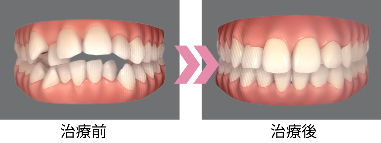 こうした症状の場合、当院では、まず最初に奥歯の傾きをまっすぐに矯正します。